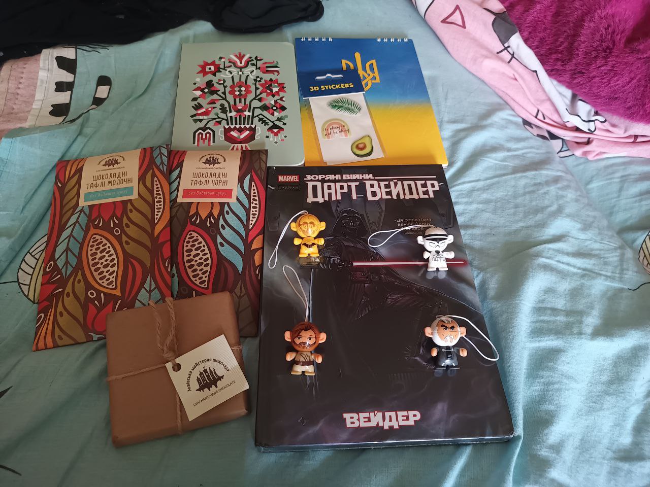 Не буду говорить кто, но мне прислали вот такой крутой подарок. Комикс про Вейдера, очень вкусный шоколад (особенно белый), ЗВшные минифигурки из киндеров, блокнотики и наклейки.